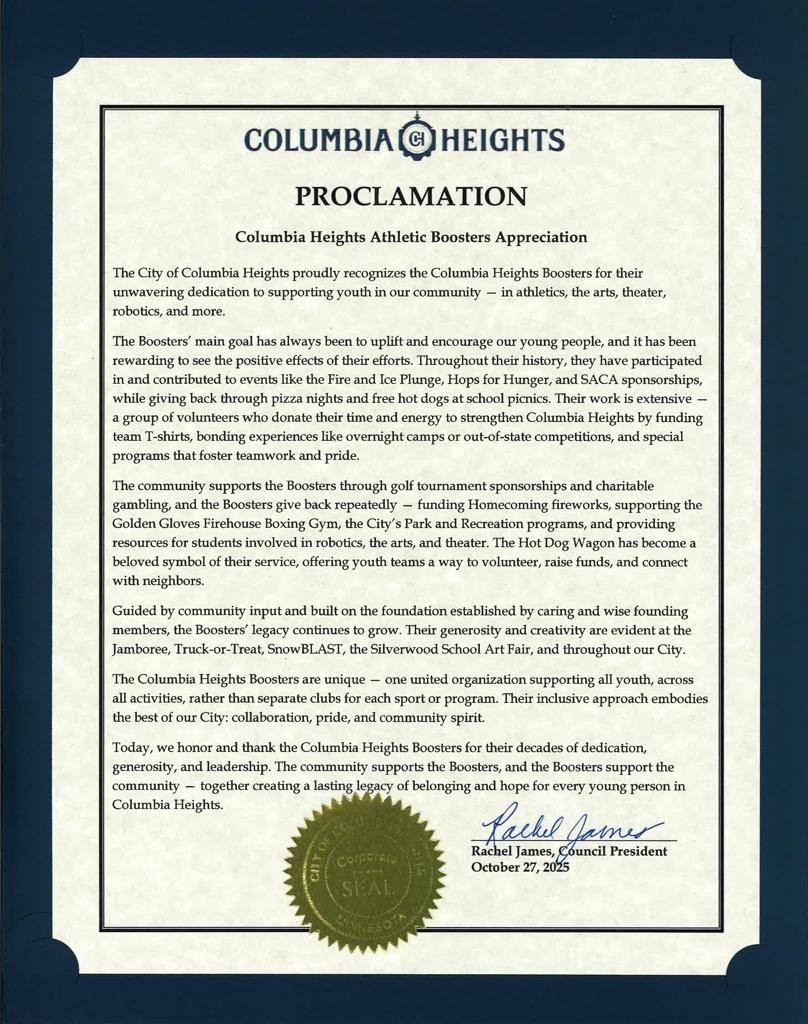 City of Columbia Heights Proclamation recognizing the Columbia Heights Boosters - October 27, 2025
